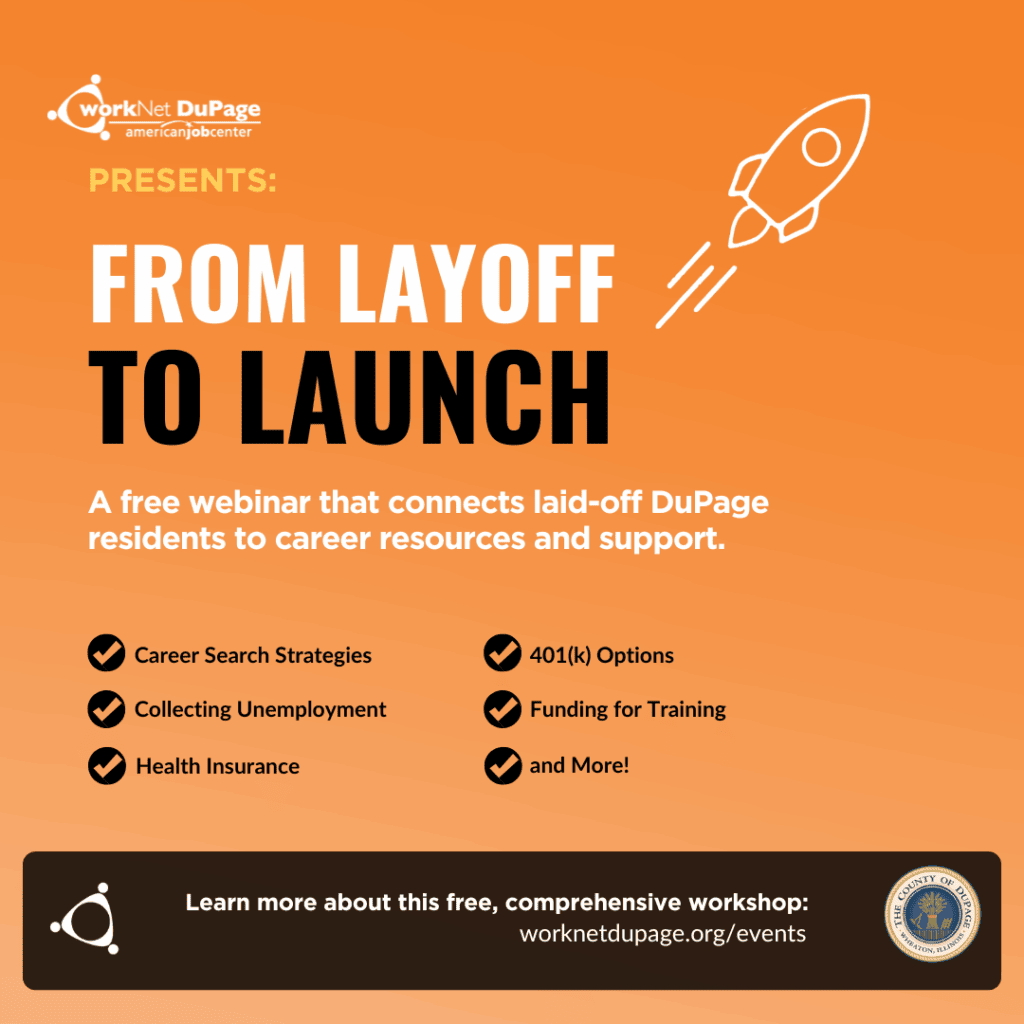 FROM LAYOFF TO LAUNCH is a FREE Webinar that connects DuPage County residents laid-off to proven, no cost, federally-funded career resources and support. It includes authoritative information about unemployment insurance and healthcare as well as job search support.